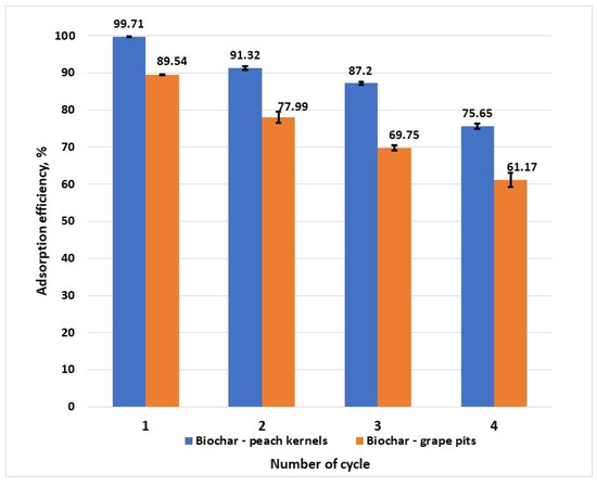 From the practical point of view, the regeneration and reusability of an adsorbent are decisive factors that determine the long-term applicability of the material. Adsorption–desorption experiments showed that biochar from peach kernels maintains a removal efficiency over 75% after four cycles (Figure 11), while biochar from grape pits showed a faster aging of the structure and a removal efficiency of 77.99% after the second cycle. The decrease in removal efficiency can be attributed to the gradual occupation of active sites with hexavalent chromium ions that are strongly bound, as well as to the structural changes. Nevertheless, the biochar from peach kernels has the ability to maintain high Cr6+ removal efficiency over multiple cycles.