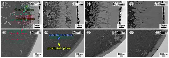 Figure 3 shows the morphology and detailed microstructure of the interfacial diffusion layer between the CoCrFeMnNi HEA and Al diffusion couple obtained after holding at 680 °C for 30 min, 60 min, 120 min and 240 min. There is the same black ribbon in samples like Figure 2d; the black ribbon is the gap between the HEA and the interdiffusion area. As can be observed in Figure 3a–d, the stripes in the L4 layer gradually change to blocks, demonstrating that the dark gray phase is doped in the bright gray phase. With the increase in holding time, the dark gray phase, trending to the Al side, grows from the blocks to thick strips. The bright gray phase approaching the CoCrFeMnNi HEA side grows into a whole sheet, forming the matrix of the dark gray phase. Note that the crack in the diffusion layer mostly occurs at the CoCrFeMnNi HEA/L1 interface, which should be attributed to the fact that the L1 layer is thinner than the other layers, and internal stress would thus be generated. It is also worth noting that the eutectic microstructure, in the form of short rods or thin strips, appears densely at the core of the Al side for the sample held for 30 min, as shown in Figure 3e. The precipitate phase and the eutectic structure appear together in the sample held at 680 °C for 60 min. The yellow arrows indicate the precipitate phases, which appear brighter due to their different contrasts. The blue arrows point to the dark gray matrix, which is aneutectic structure, shown in Figure 3f, and when the duration time increases to 240 min, the main phase in the Al core is solely the eutectic structure, which is shown in Figure 3h. Both the above precipitate phases grow toward the direction of the center of the circle as the holding time increases. Figure 4 shows the morphology of interfacial diffusion layers between CoCrFeMnNi HEA and Al diffusion couple being treated at 700 °C, holding for 30 min, 60 min, 120 min and 240 min. It is found that the dark gray phase grows partially until covering the whole L4 layer as the holding time increases from Figure 4a to Figure 4d. As can be seen from Figure 4e to Figure 4h, large strip phases with individual tissue up to 0.7 mm in length can be observed on the Al side, and the growing direction is towards the center of the circle.