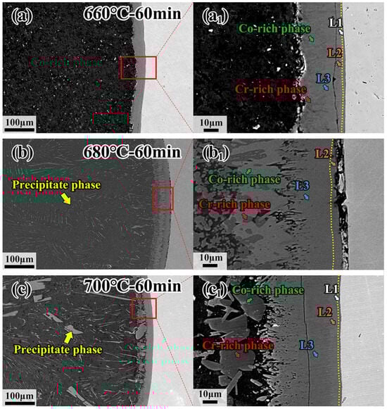 Microstructure of interfacial diffusion layer and internal precipitation phases in CoCrFeMnNi/Al solid–liquid diffusion couples after annealing at (a,a1) 660 °C—60 min; (b,b1) 680 °C—60 min; (c,c1) 700 °C—60 min.