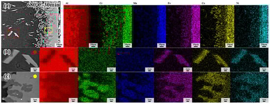 (a) EDS mapping results of CoCrFeMnNi/Al solid–liquid diffusion couple; (b) EDS mapping results of interfacial diffusion layer; (c) EDS mapping results of internal precipitation phase after annealing at 680 °C for 30 min.