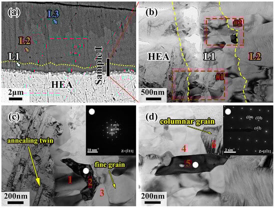 Samples I, II and III, which were held at 700 °C for 120 min, cutting from the interdiffusion layer by the Focused Ion Beam Technique (FIB) due to the tiny size of the L1 layer, are represented as HEA-L1-L2, L2-L3, and L4, respectively. Figure 7c,d show enlarged images of regions 1 and 2 in Figure 7b. As can be seen in Figure 7c, annealed twins are found in the CoCrFeMnNi HEA by recrystallization during diffusion. However, fine crystals are generated at the CoCrFeMnNi HEA/L1 interface, and the L2 layer exhibits the coarse columnar crystals growing directionally. It was noted that the L1 layer is close to the CoCrFeMnNi HEA, and a relatively fast cooling rate and a large subcooling degree for crystallization would be induced. Additionally, a large amount of latent heat of crystallization would be released when the fine crystal zone forms, and it becomes difficult for liquid metal to dissipate heat and solidify due to the formation of interstices between solid CoCrFeMnNi HEA and liquid Al during solidification. Both of the above factors decrease the subcooling degree, making it difficult for nuclei to form. Eventually, the columnar grains grow perpendicularly due to the advantage in heat dissipation direction.