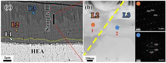 Figure 8 shows the TEM results of sample II. It can be observed that sample II contains L2 and L3 diffusion layers whose grains are both columnar crystals. As further confirmed, the diffraction pattern at position 1 is identical to the Al13Co4 phase while position 2 coincides with the Al4Cr phase. The zone axes are reported [001] and [11], respectively. Therefore, it can be inferred that the L2 layer consists of Al13(Co, Cr, Fe, Mn, Ni)4 phase, while the intermetallic compound of the L3 layer is Al4(Co, Cr, Fe, Mn, Ni) phase, which coincides with the EDS results in Table 3.