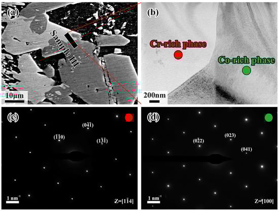Figure 9a shows the processing position of the FIB for sample III, using the same method as samples I and II. According to the EDS results in Table 4, sample III is composed of the Mn/Cr-rich region in the left and the Co/Fe/Ni-rich region in the right, which is consistent with the previous description. As identified by the SAED shown in Figure 9c,d, the red region, being rich in Cr element, corresponds to Al4Cr phase, while the green region enriched in Co element represents Al9Co2 phase, with the zone axis being [14] and [100], respectively. In that regard, the red and green regions are supposed to be the Al4(Cr, Mn) phase and Al9(Co, Fe, Ni)2 phase due to atomic substitution or occupation of vacancies, which clearly explains the presence of other elements by EDS analysis.
