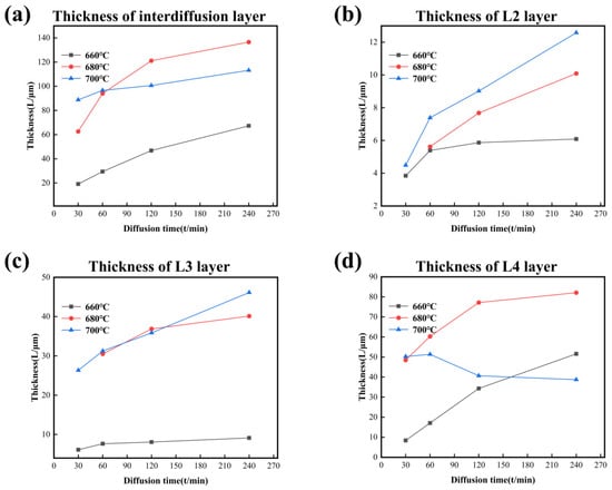 Figure 10 shows the thickness changes of the interdiffusion area and each layer with variation of temperature and time. The thickness of the interdiffusion area and each layer increases with time at all temperatures except the L4 layer, which decreases at 700 °C after the holding time reaches 60 min. The changes in thickness of the L4 layer indicate that elemental precipitation of CoCrFeMnNi HEA in the Al core occurs when the holding time is longer at 700 °C. In dynamics, the increased vibration frequency expands the atom’s ability to detach the bondage at the balance position due to the more energy at high temperatures. Meanwhile, the diffusion of atoms needs enough time to reach the core of Al. Under the comprehensive effect, the change discipline of thickness in the L4 layer after 60 min is abnormal compared to other layers. In addition, temperature is the main factor influencing the growth of the interdiffusion area because the growth rate and diffusion time are inversely proportional, especially at 680 °C and 700 °C. This viewpoint could be evidenced by the phenomenon that the thickness of the interdiffusion area or single layer was minimum at 660 °C.