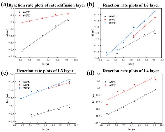 Reaction rate plots of IMCs layers form at different temperatures in CoCrFeMnNi/Al solid–liquid diffusion couples. (a) Interdiffusion layer; (b) L2 layer; (c) L3 layer; (d) L4 layer.
