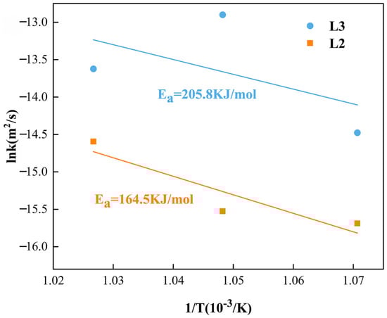 For the diffusion layer that grows by an interfacial reaction mechanism, such as the L4 layer, the energy required for the redistribution of solute atoms at the interface and the formation of a new phase can be calculated accordingly, instead of using the activation energy of growth. Therefore, this section only calculates the activation energy of growth in the L2 and L3 layers during the diffusion process.