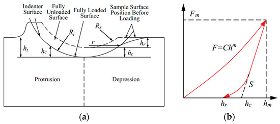 The indentation test generally comprises two stages: the loading and unloading processes. During loading, the indenter presses into the specimen surface, initially causing elastic deformation in the contact region. As the load increases, the region experiencing the greatest elastic deformation begins to yield, entering the elastoplastic stage [24]. Figure 1a illustrates a schematic of the indentation profile created by a spherical indenter. Material parameters such as hardness and elastic modulus are typically derived using the Oliver-Pharr method. The typical load–depth curve from the indentation test is shown in Figure 1b. For a given indenter geometry, the unloading stiffness determined from the unloading segment:
