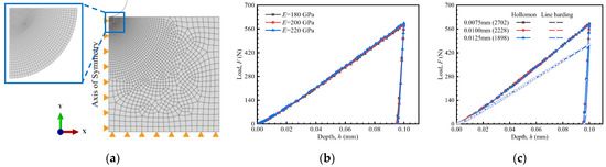 The elastic modulus of most steels commonly used in engineering structural components typically ranges from 190 to 220 GPa [35]. Potential influence of the elastic modulus was also investigated to illustrate possible impact on the load–depth curve using Hollomon model. As illustrated in Figure 2b, simulation results indicate that the effect of elastic modulus is negligible, in agreement with [36]. Therefore, the elastic modulus of the value of 200 GPa was used in all numerical simulations.
