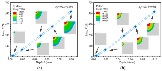 Load–depth curves from indentation tests and corresponding stress distributions from FEA (Hollomon model, σ0 = 400 MPa, δ = 0.008): (a) Mises stress; (b) PEEQ.