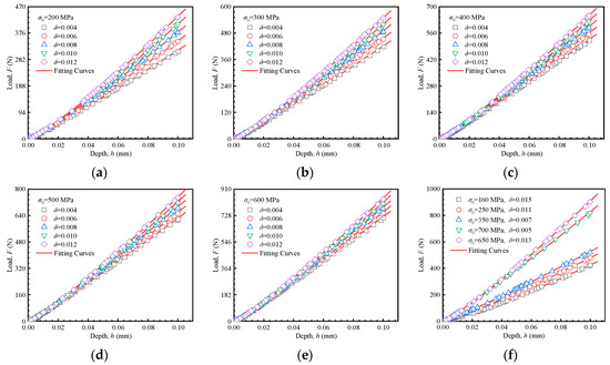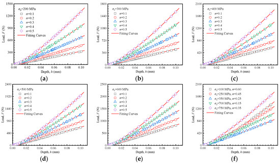 Load–depth curves of the linear hardening model. (a) σ0 = 200 MPa, (b) σ0 = 300 MPa, (c) σ0 = 400 MPa, (d) σ0 = 500 MPa, (e) σ0 = 600 MPa, (f) data utilized for initial validation of predictive formula.