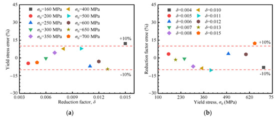 Relative errors based on the linear hardening model. (a) Yield stress vs. reduction factor, (b) Reduction factor vs. yield stress.