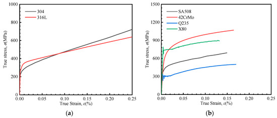 The stress–strain curves obtained from uniaxial tensile tests are presented in Figure 15. It can be observed that SS304 and SS316 are accurately described by the linear hardening model. While SA508, 42CrMo, Q235, and X80 are more appropriately fitted using the Hollomon model.