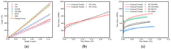 Load–depth curves and prediction results of true stress–strain curves. (a) Load–depth curves and fitting curves for all six materials, (b) prediction results of SS316L and SS304 by the IIT approach, (c) prediction results of SA508, 42CrMo, Q235 and X80 by the IIT approach.