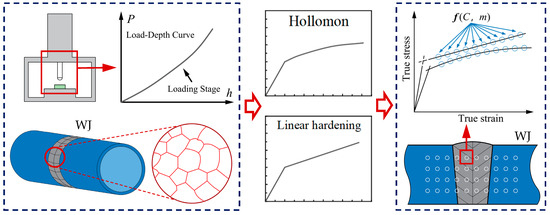 Accurate evaluation of mechanical properties, particularly plastic behavior, is essential for assessing the structural integrity of important mechanical structures. These properties directly affect the safe operation of such structures [1]. However, critical components, such as pressure vessels, welded joints, and long-distance pipelines, often undergo complex local variations in material properties during manufacturing. Furthermore, harsh service conditions-including high temperatures, pressures, and electrochemical corrosion-can accelerate the degradation in structural materials [2,3]. As a result, the mechanical properties within a structure can become highly heterogeneous, influencing both its load-bearing capacity and failure behavior [4]. Conventional mechanical property evaluations are typically performed under uniaxial loading and require the extraction of components to prepare standardized specimens. These methods face significant limitations when applied to in-service structures, where preserving structural integrity is essential. Therefore, to improve the efficiency of structural integrity assessments and service life predictions, there is an urgent need for advanced in situ and non-destructive techniques capable of accurately evaluating local mechanical properties.
