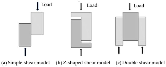 Traditional approaches to measure interfacial shear strength include the direct shear test [13,14,15] and skew shear test [16,17,18]; the direct shear test is further categorized into the simple shear test and double shear test. The principle of original simple shear test is illustrated in Figure 1a. A pair of shear forces is applied to the opposite sides of the specimen, and shear strength can be obtained by measuring the failure load. For this approach, the asymmetric loading configuration is prone to inducing additional bending moments, leading to stress concentration and significant variability in testing results. To address this problem, Hofbeck et al. [19] proposed a Z-shaped shear specimen in 1969, as shown in Figure 1b. Compared to the original simple shear test model, this Z-shaped specimen can reduce the bending stresses caused by eccentric loads. Although the Z-shaped model is an improvement over the simple shear test, the fabrication of the specimen is more complicated and dimensional deviation also leads to inaccurate results. Moreover, additional devices are also needed to provide lateral pressure to minimize the effect of bending stress in the Z-shaped model. Compared to the simple shear test, the double shear test [20,21] (shown in Figure 1c) is less affected by bending stress and yields more reliable results. The double shear specimen features a symmetrical configuration with two shear planes where the bending moments generated on two interfaces counteract each other during loading. However, the fabrication of double shear specimens is also complicated and the specimen often randomly fails at only one side.