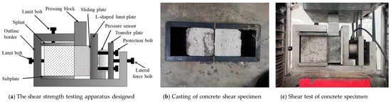 Concrete, consisting of cement, sand and gravel, is one of the most important building materials in the world. Compared to other materials, concrete exhibits excellent mechanical performance and durability in different environmental conditions. However, under the effect of loading and environmental erosion, aging and deterioration are inevitable, so surface repair or structural strengthening become necessary for concrete structures after a certain period of service. Currently, casting new concrete onto the surface of processed old concrete is the most widely accepted fixing approach. In most protective restoration conditions, adhesive strength is the most important factor for the patching material to avoid peeling off [1,2,3]. However, for other reinforcement conditions, such as piers and columns, the structures are perpendicular to ground and may subjected to shear forces, so they need not only adequate bond strength but also high shear strength. Currently, the methodology to test bond strength has been well-established, and reliable results can be obtained by tensile tests [4,5,6,7] and splitting tests [8,9,10,11,12]. However, methods for testing shear strength are relatively limited, standardized equipment has not been proposed, and non-standard equipment exhibits significant shortcomings. So, there is an urgent need to develop a reliable and efficient device for testing shear strength.