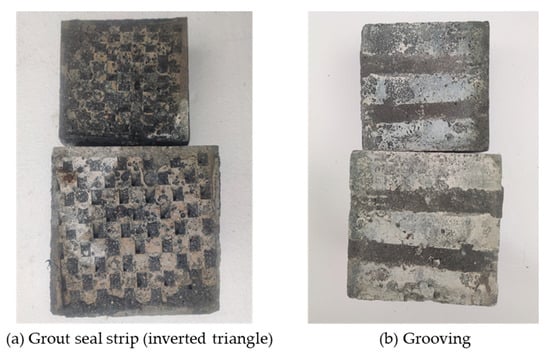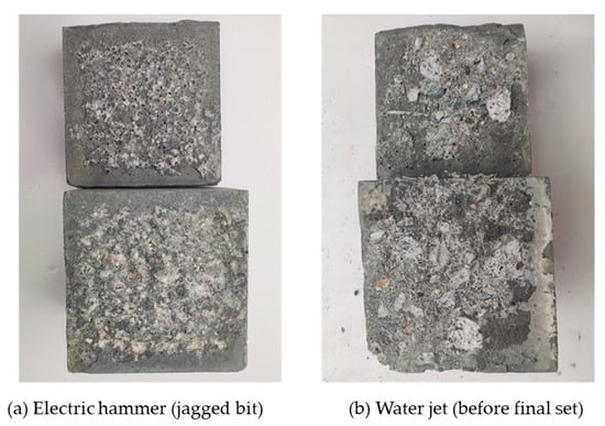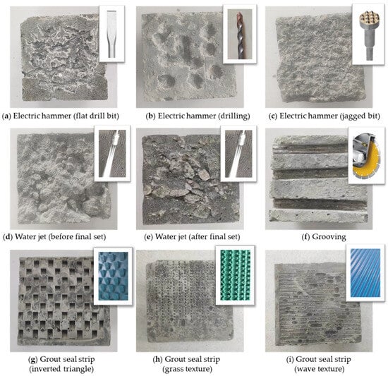 In this paper, electric hammering, water-jetting, grooving, and grout seal strip were used to roughen the surfaces of old concrete. The morphologies of concrete surfaces obtained using the different treatment methods are shown in Figure 3.