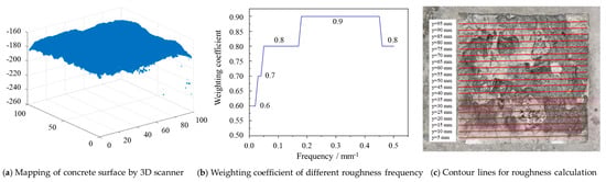 Characterization of concrete surface roughness. (a) The 3D coordinate surface of concrete obtained by HSCAN PRINCE775 scanner. (b) Weighting coefficient of different roughness frequencies. (c) Contour lines selected for roughness calculation.