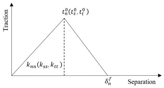 The constitutive model of the interface connection used in this paper is the traction-separation model, which is a cohesive model assuming the interface has zero thickness. It is assumed that when the interface satisfies the damage criterion of Equation (3), damage begins to occur. After damage occurs, the damage assessment is determined based on the total fracture energy or the total plastic displacement at failure, as shown in Figure 5.