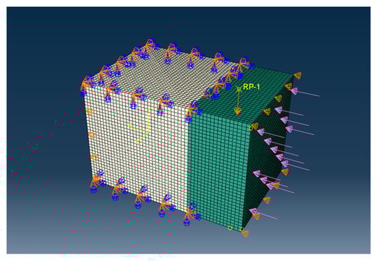 The boundary conditions were established in accordance with the actual constraints and loading conditions in shearing test, as depicted in Figure 6. The top and bottom surfaces of NC were rigidly fixed, and the left side was constrained to restrict transverse displacement. A lateral constraint was applied to the right side of the UHPC to prevent lateral translation or tilting, and a small transverse load of 100 N was also applied on the right side of the UHPC to ensure close contact between the UHPC and the PTFE plate during testing. This load can also minimize the friction during the test. Given that the coefficient of friction between the PTFE plate and steel is less than 1, the friction during the shear test is below 100 N, which is much smaller than the failure load in the shear test (less than 0.5%) and has negligible influence on the testing result.