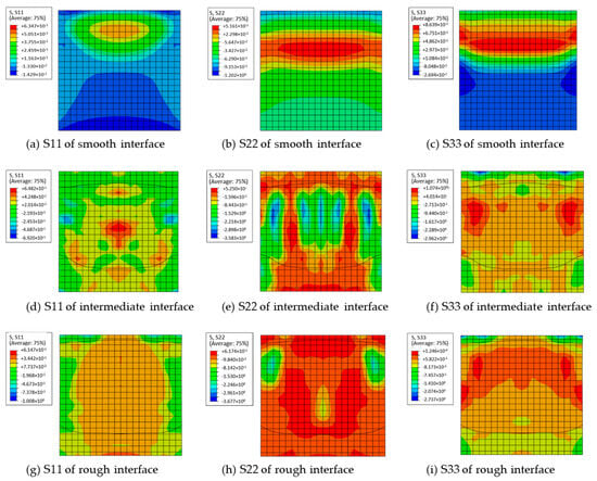 The stress distributions of concrete models with different roughnesses are shown in Figure 7, and the maximum normal stresses in different directions are presented in Table 4. Herein, the S11, S22 and S33 represent the normal stress in the horizontal direction, vertical direction and the direction perpendicular to the interface at the UHPC-NC interface, respectively.