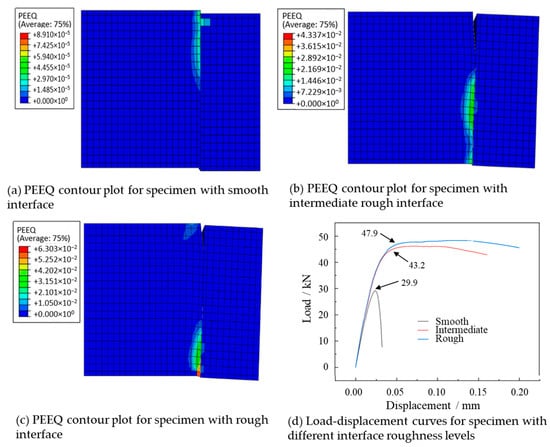 Plastic Equivalent Strain (PEEQ) is a key indicator in ABAQUS 2019 for evaluating the plastic state of materials [29,30]. The value greater than zero indicates the onset of element yielding, while the maximum value signifies that the material is approaching failure. As we can see from the PEEQ contour plots in Figure 8, the maximum values of PEEQ all occur at the interface and are biased towards the NC side regardless of surface roughness. This is because the UHPC has higher strength and toughness, which can resist the extension of the failure region towards the UHPC side. Furthermore, we can also see from Figure 8 that with the increase of roughness, the location of preferential failure gradually shifts from the upper part to the lower part of the interface due to the dilatancy effect of concrete.