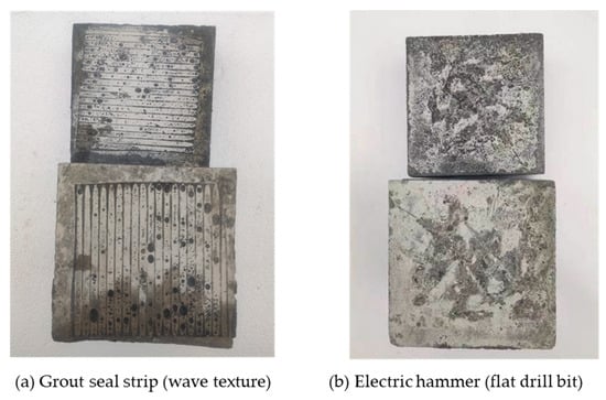 - Surface processing of old concrete: The old concrete, which was initially cast using a 100 mm × 100 mm × 100 mm mold, had its surface roughened using different methods to achieve the desired surface texture.