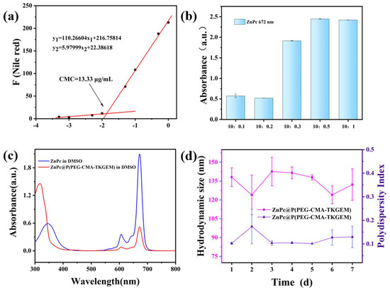 (a) The relationship between CMC values and precursor concentration of polymerized GEM; (b) the absorbance of ZnPc changes with the feeding ratio; (c) UV-Vis spectra of ZnPc and ZnPc@P(PEG-CMA-TkGEM); (d) particle size measurement of nano-prodrug micelles within 7 days.