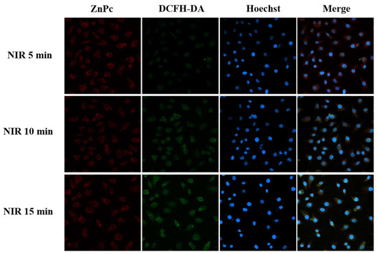 After internalization into cells, ZnPc within ZnPc@P(PEG-CMA-TKNPC) (Figure S13) and ZnPc@P (PEG-CMA-TKGEM) (Figure 5) emitted red fluorescence, allowing visualization of polymer entry. The intensity of red fluorescence correlated with the number of nano-prodrug micelles internalized, with stronger fluorescence indicating higher cellular uptake; microscopy images showed that red fluorescence was predominantly localized in the cytoplasm. This is because ZnPc, released after micelle endocytosis, rarely translocates into the nucleus. Following NIR irradiation, intracellular ROS levels increased over time, leading to a gradual enhancement of green fluorescence. Green fluorescence was distributed throughout the cell but concentrated primarily between the nucleus and cell membrane, with significant overlap with ZnPc localization. In merged images, red fluorescence of ZnPc dominated at short irradiation times; however, as ROS levels increased, green fluorescence gradually intensified and nearly overlapped with red fluorescence. These results demonstrate that intracellular ROS levels increase significantly with prolonged NIR irradiation, directly confirming the carriers’ ability to generate ROS under NIR stimulation.