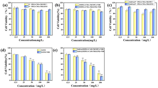 (a) Vector toxicity without NIR irradiation and without ZnPc loading; (b) Vector toxicity under NIR irradiation without ZnPc loading; (c) vector toxicity without NIR irradiation and loaded with ZnPc; (d) vector toxicity of GEM with and without NIR; (e) vector toxicity under NIR irradiation and loaded with ZnPc. (* p < 0.05, ** p < 0.01).