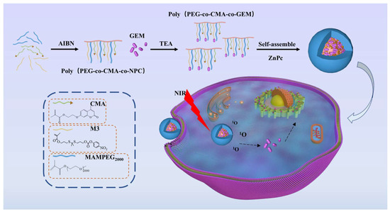 Zinc phthalocyanine (ZnPc) is a photosensitizer with high singlet oxygen quantum yield, widely used in photodynamic therapy (PDT). It generates ROS under NIR irradiation, which can directly act on tumor tissues [27,28,29]. Notably, while previous studies have reported ROS/NIR-responsive drug delivery systems, these systems often lack integration of multiple functions or exhibit limited release efficiency. Herein, we designed a tri-functional NIR-responsive system ZnPc@P(PEG-CMA-TKGEM) that integrates (Scheme 1): (i) ZnPc as a photosensitizer (for ROS generation and red fluorescence imaging); (ii) thioketal (TK) linkers (ROS-specific cleavage, avoiding TME non-specificity); (iii) amphiphilic polymer backbones (PEG for circulation stability, CMA for hydrophobic core formation). This design ensures: (a) protection of GEM from cytidine deaminase degradation via covalent conjugation; (b) spatiotemporal drug release triggered by exogenous NIR (no off-target activation); (c) synergistic chemo-photodynamic therapy (GEM + ROS from ZnPc), which overcomes the low efficacy of single-modal therapy.