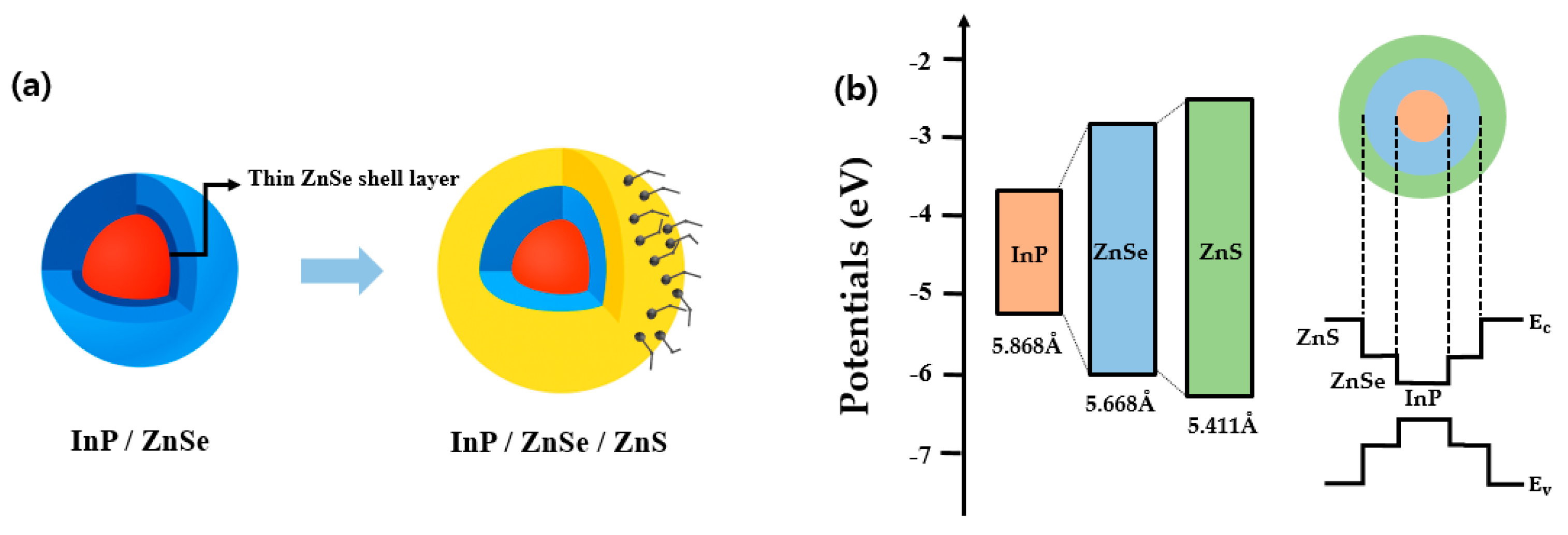 - Chen, H.-S.; Chen, C.-Y.; Wu, Y.-C. High-Performance Giant InP Quantum Dots with Stress-Released Morphological ZnSe–ZnSeS–ZnS Shell. Adv. Mater. 2025, 37, 2407026. [Google Scholar] [CrossRef] [PubMed]