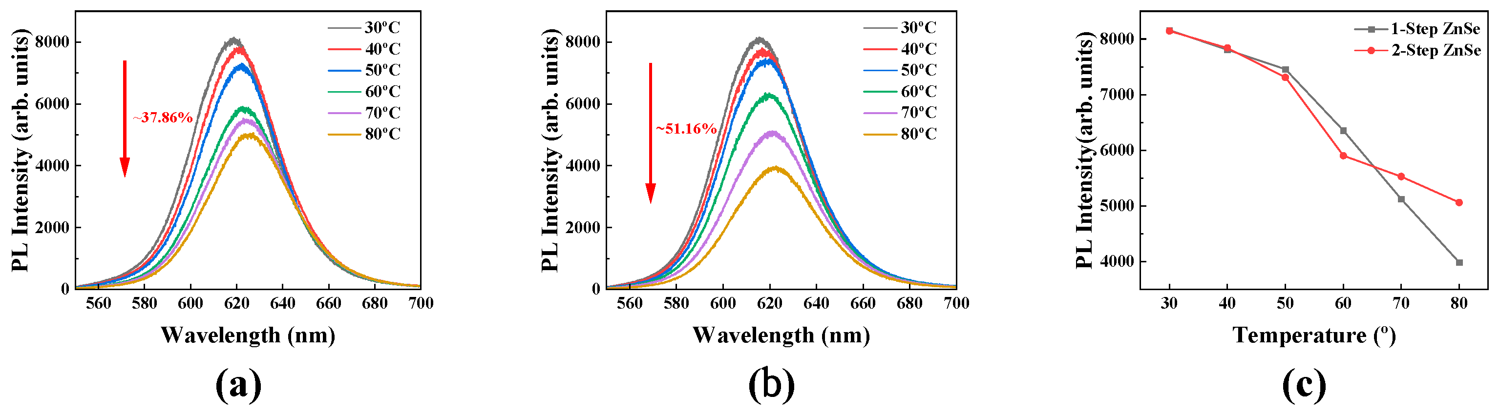 - Zhao, Y.; Riemersma, C.; Pietra, F.; Koole, R.; de Mello Donegá, C.; Meijerink, A. High-Temperature Luminescence Quenching of Colloidal Quantum Dot. ACS Nano 2012, 6, 9058–9067. [Google Scholar] [CrossRef]