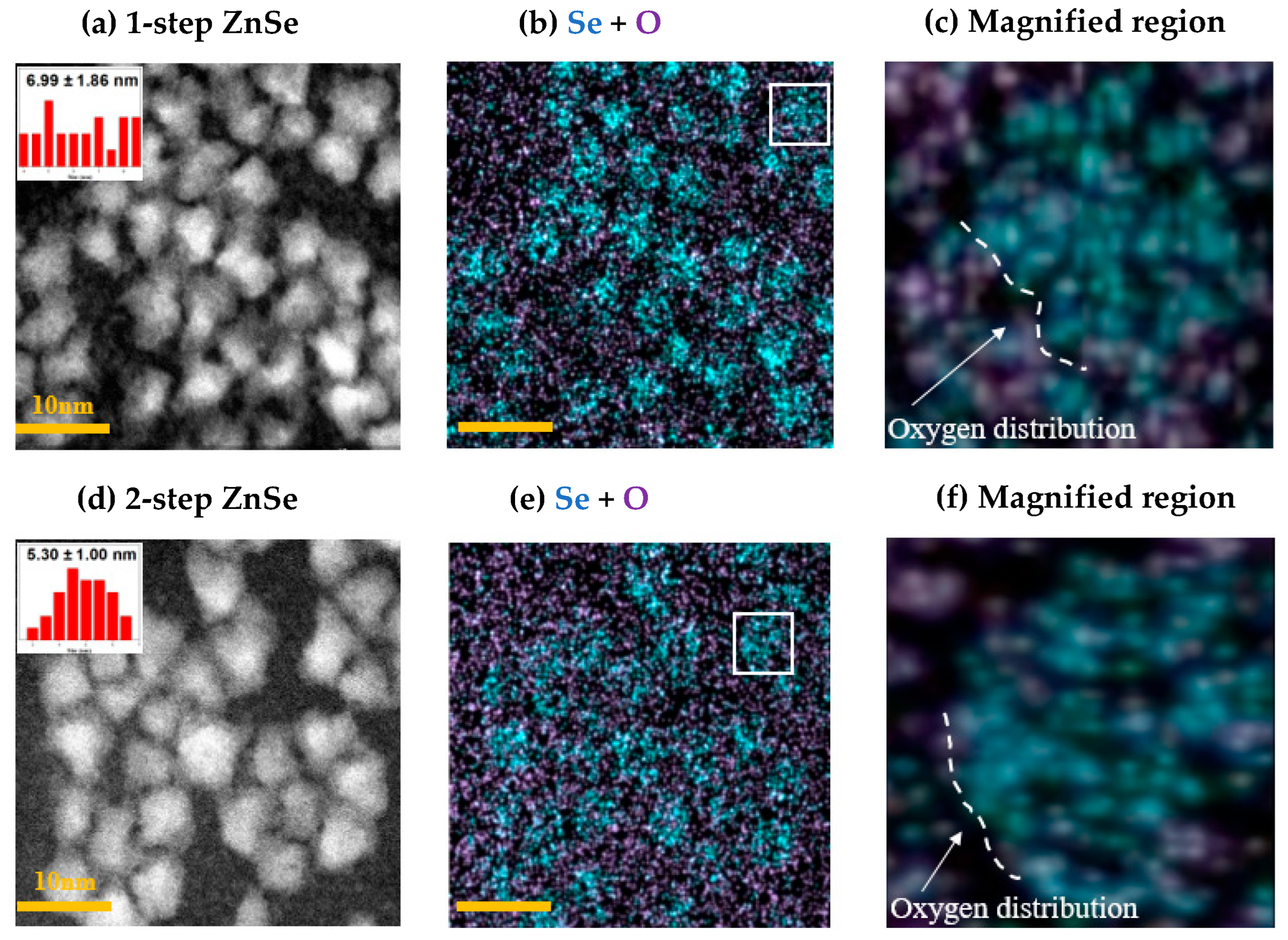 - Baek, H.; Kang, S.; Heo, J.; Choi, S.; Kim, R.; Kim, K.; Ahn, N.; Yoon, Y.; Lee, T.; Chang, J.; et al. Insights into structural defect formation in individual InP/ZnSe/ZnS quantum dots under UV oxidation. Nat. Commun. 2024, 15, 1777. [Google Scholar] [CrossRef]