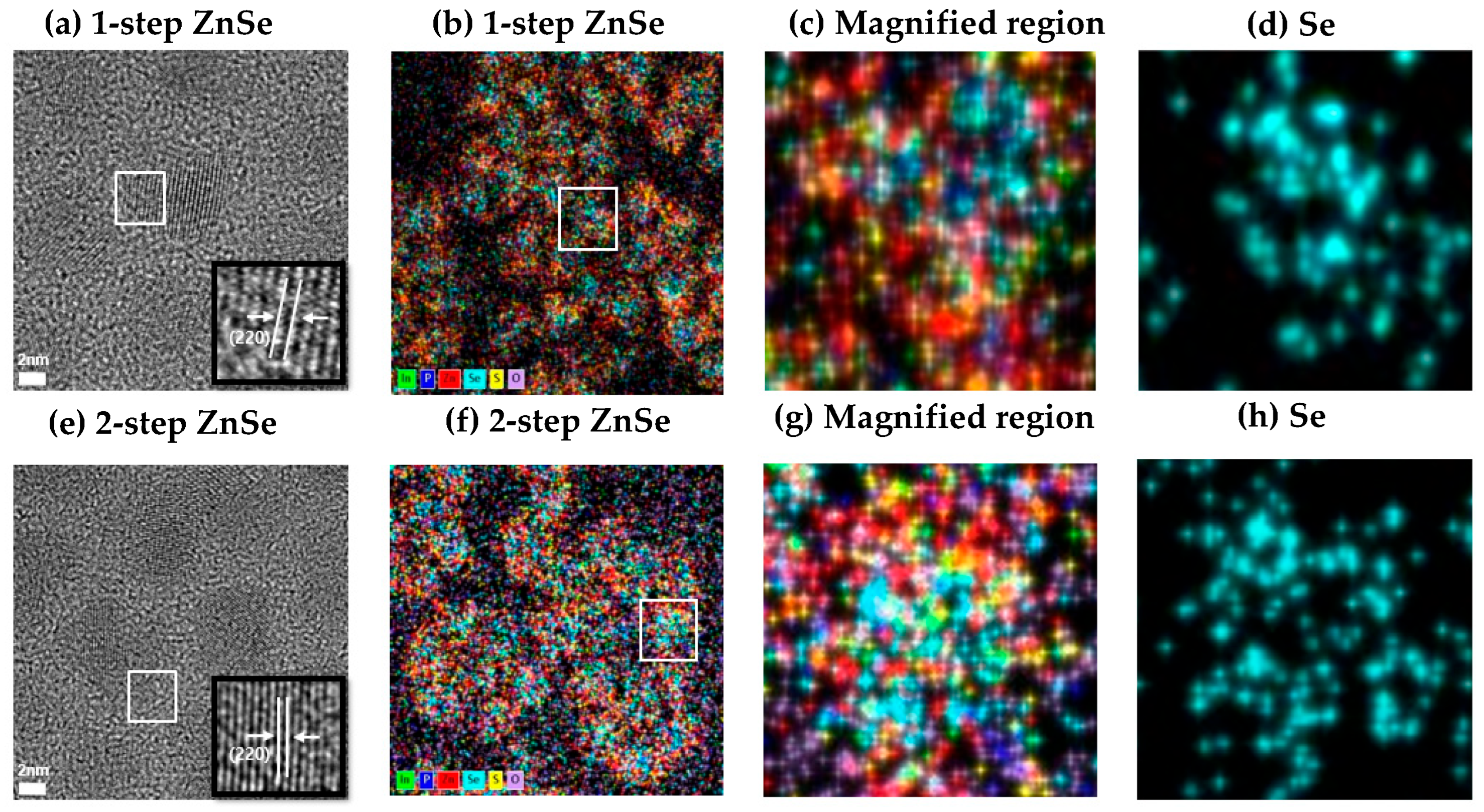 - Choi, Y.; Hahm, D.; Bae, W.K.; Lim, J. Heteroepitaxial chemistry of zinc chalcogenides on InP nanocrystals for defect-free interfaces with atomic uniformity. Nat. Commun. 2023, 14, 43. [Google Scholar] [CrossRef]