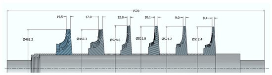 The flow geometry design was prepared using the 0D algorithm developed at the Institute of Fluid Flow Machinery, Polish Academy of Sciences, created in the Matlab R2021a environment [34]. A 0D meridional view of the compressor is presented in Figure 2, and the number of blades in the impellers, diffusers, and return channels of each stage is presented in Table 1.