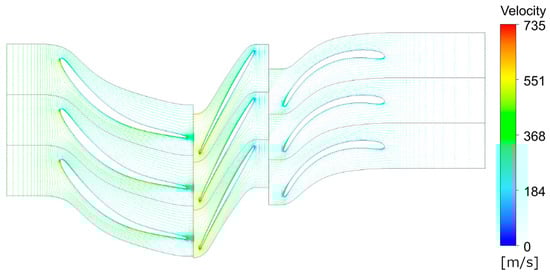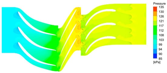 Figure 3 shows the pressure contours along various segments of the first compressor stage. The results of the numerical simulations for the target configuration are presented in Figure 4, which illustrates the velocity variation across different sections of the stage in the form of vector fields. The efficiency found for CFD calculations of the first stage is equal to 79% as compared to 75% obtained from the 0D approach.