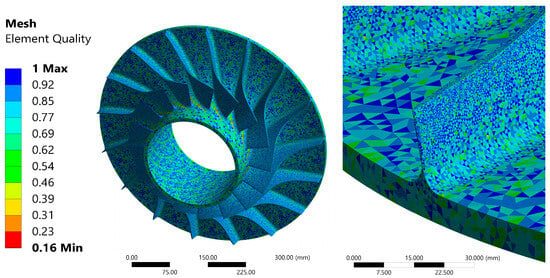 The quality of elements significantly decreased near the outer edge of the impeller and in areas where the element size is disproportionately large, mainly in the region between the blades. In the area of the blade edge, the quality of the elements is high, and no elements with a quality lower than 0.5 are visible.