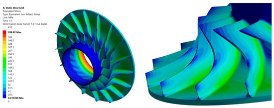 One illustrative example is the publication [30], in which the issues of the strength of axial turbine impellers were discussed. The authors presented an optimisation method with the objective of enhancing the rotor’s strength, with a particular focus on modifications to the computational grid in order to reduce the calculation time.