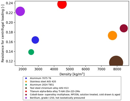 The vertical axis defines resistance to centrifugal loading (RCL-dimensionless value), and the horizontal axis represents material density (ρ-in kg/m3).