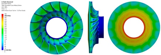 Stress values in the impeller with a disc material of AISI 420 alloy: front view (left); side view (centre); back view (right).