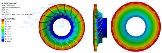 Total deformation in the impeller with a disc material of AISI 420 alloy: front view (left); side view (centre); back view (right).