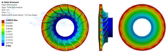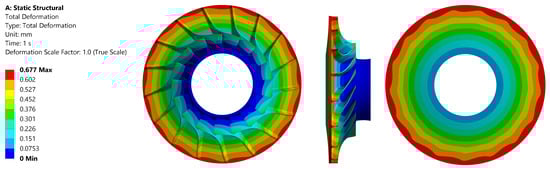 The maximum value of the reduced stress observed in the material that was subjected to testing was 645 MPa. This value is comparable to that of aluminium alloys. It is evident that the material demonstrates considerably higher strength than the maximum loading value that was obtained. This finding offers a potential avenue for modifying the rotor design to achieve higher compression at the stage of the machine. However, this material is characterised by a significant drawback in terms of cost, which is several times higher than that of aluminium or steel alloys. The distribution of reduced stress in the material is illustrated in Figure 13, while Figure 14 presents the total deformation.