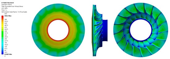 The results of the load distribution analysis suggest the potential for further optimisation of the rotor wheel’s shape. In areas proximate to the outer diameter, where forces are minimal, the potential benefits of incorporating specific notches (scallops) should be considered, as this could result in a reduction in mass and an enhancement of the overall structural efficiency of the component. The maximum calculated balanced load reached a value of approximately 400 MPa, which is well below the material’s strength limits. The yield strength of aluminium 7075 T6 is reported to range from 460 to 530 MPa, while its tensile strength is reported to be in the range of 530 to 580 MPa.
