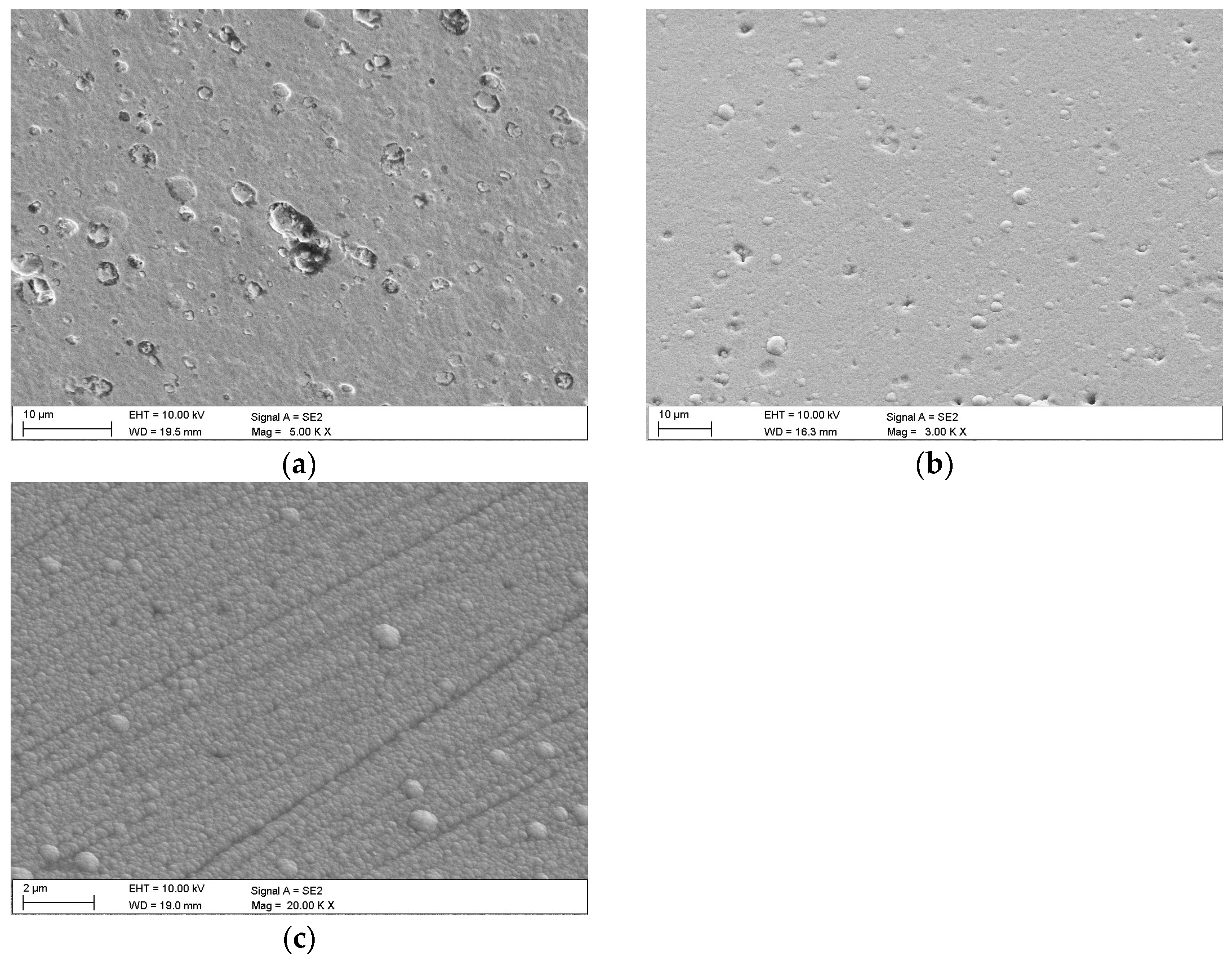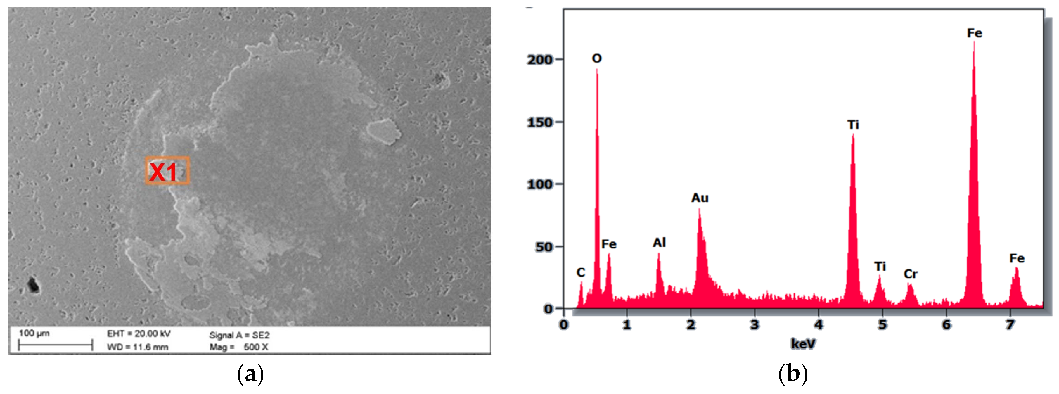 The coating topography, chemical composition, and damage resulting from the tribological test were examined using a Zeiss Supra 35 scanning electron microscope (Zeiss, Oberkochen, Germany) equipped with a Thermo Scientific EDS detector (Thermo Fisher Scientific, Waltham, MA, USA). The applied accelerating voltage was in the range of 5–20 kV. The surfaces of the preparations after tribological testing were coated with gold to ensure electrical charge dissipation during SEM testing.