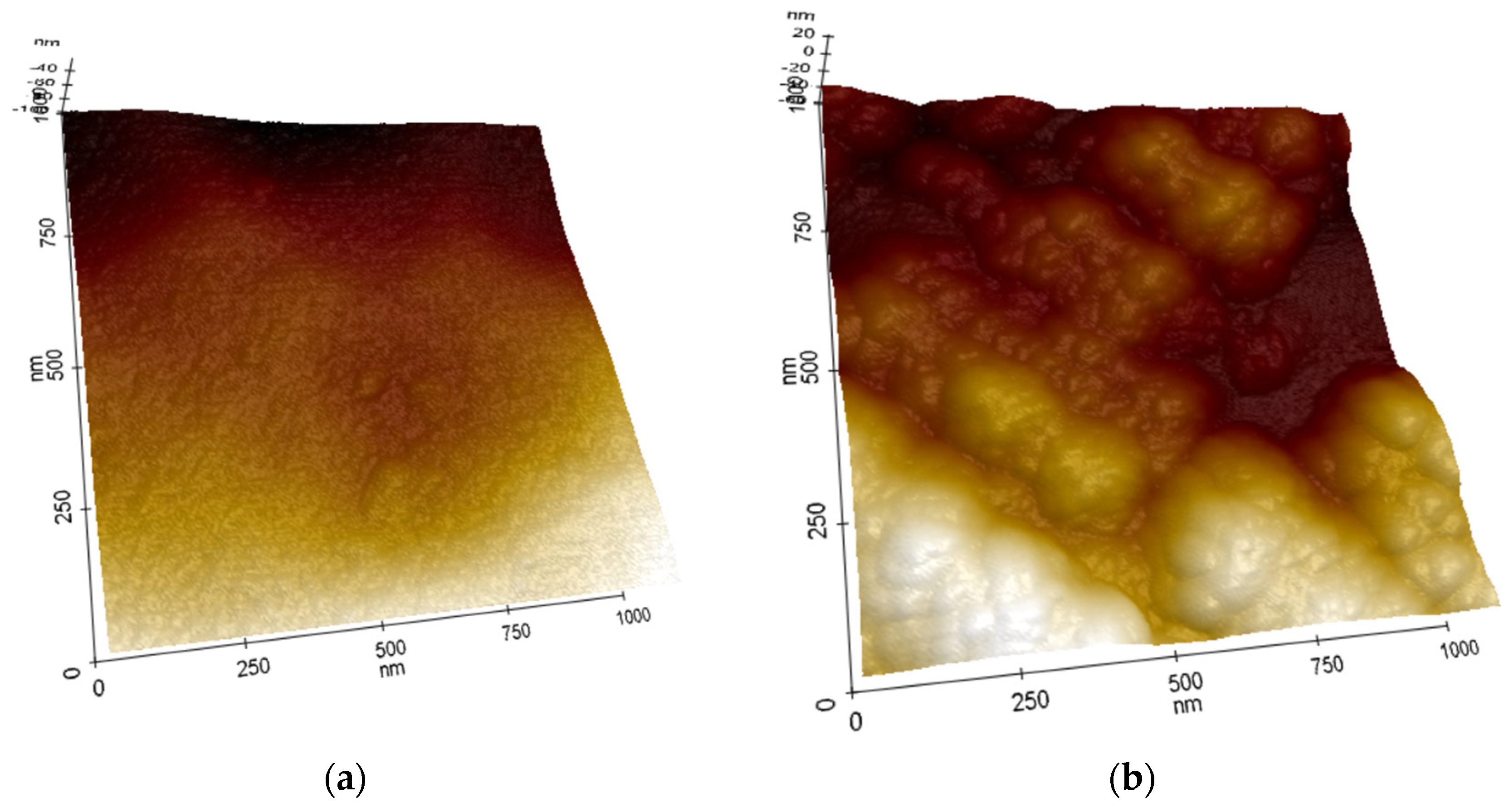The morphology of the obtained coatings was also examined using a Park Systems XE-100 atomic force microscope (Park Systems XE-100, Suwon, Republic of Korea). Measurements were carried out in noncontact mode, examining areas of dimensions 1 µm × 1 µm. A PPP-CONTSCR-type cantilever was used (high resonance frequency > 200 kHz, high spring constant > 20 N/m).