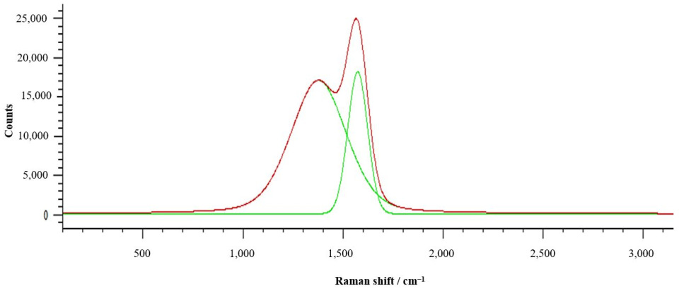 Figure 4, was fitted as a sum of two Gaussian functions corresponding to the D and G bands. Prior to deconvolution, the baseline was corrected by subtracting a linear background. The fitting was carried out using the area ratio (A_D/A_G) rather than the peak height ratio, since the integrated area provides a more accurate measure for broad and overlapping bands typically found in amorphous carbon materials. The visible broad and partially overlapping bands constitute a typical image of amorphous materials with mixed hybridisation, which clearly indicates the amorphous nature of the obtained layer and confirms its assignment to the DLC type.