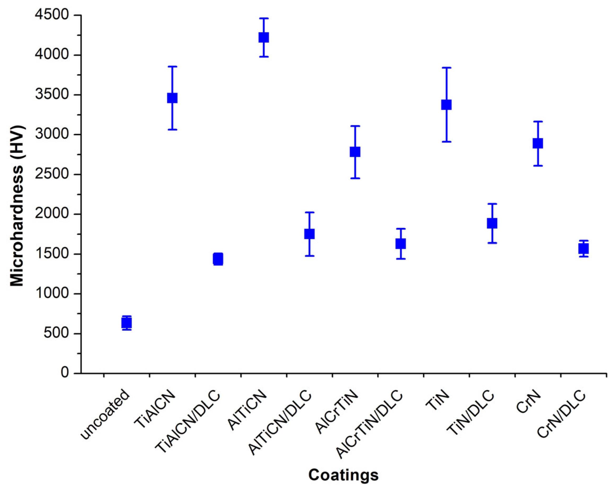 Figure 5) indicate that the highest microhardness among the coatings analysed was achieved by the AlTiCN coating (4220 HV). Similar high microhardness was also demonstrated by the TiAlCN coating (3458.78 HV) and TiN (3375 HV). Hybrid coatings of the MeN/DLC type (e.g., TiN/DLC—1884.4 HV) were characterised by significantly lower microhardness than their counterparts without a DLC layer, which can be explained by the relatively lower hardness of the DLC coating itself (1400 HV) and its influence on the characteristics of the entire coating system. At the same time, despite the lower microhardness, the presence of the DLC layer significantly improves tribological properties, as demonstrated, among others, in studies [