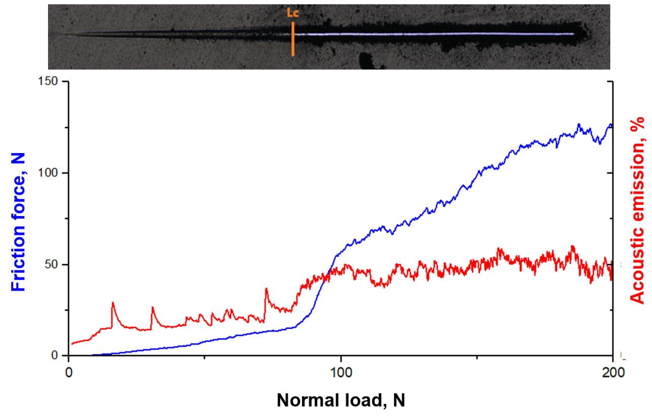 The adhesion of the coating to the substrate was measured using the Revetest RST scratch tester from Anton Paar (Anton Paar, Peseux, Switzerland). A progressive load of 0 to 200 N was applied and the measurement path length was 10 mm. The critical load Lc, at which the adhesion of the coating was lost, was determined based on the acoustic emission value recorded during the measurement and observation of the scratches created during the test.