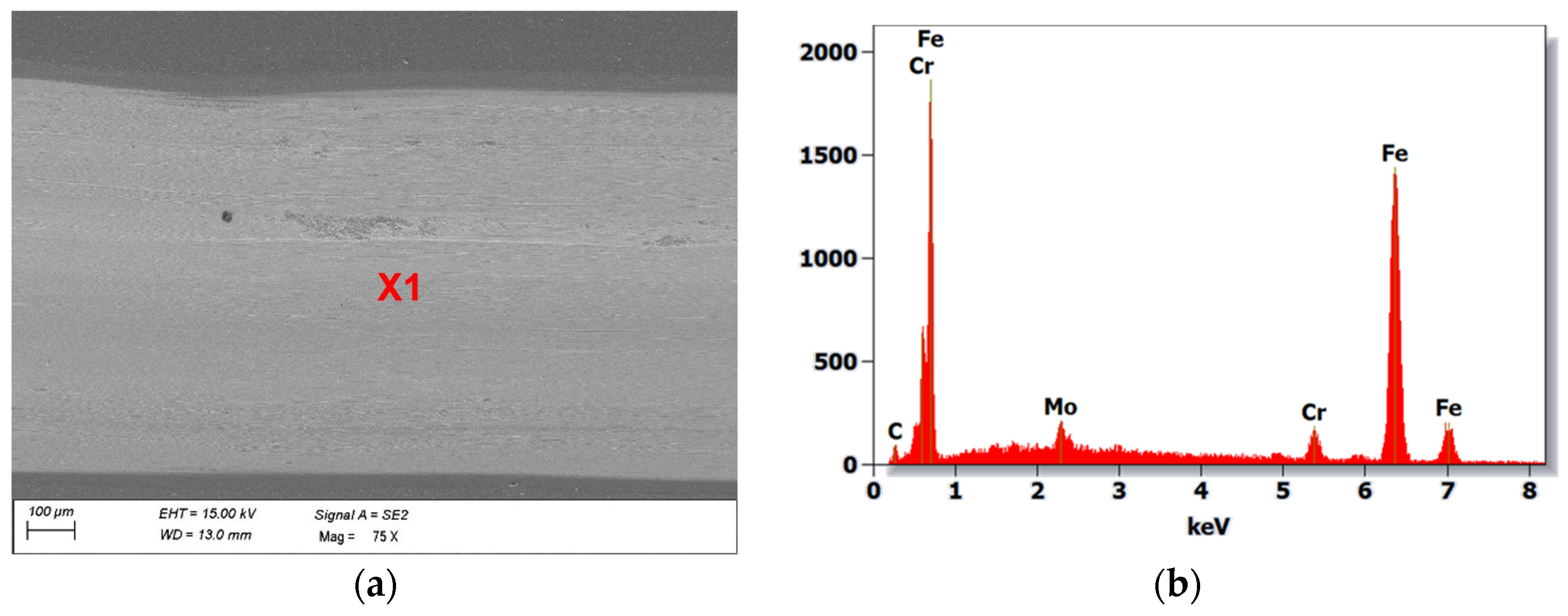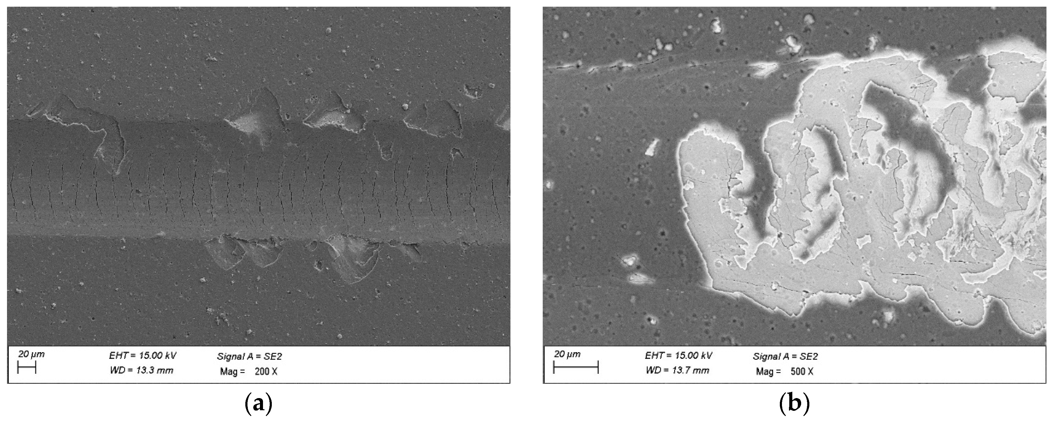 33] that chromium as a transition layer and/or as a component of the PVD coating affects the wear resistance of DLC mainly indirectly, by reducing stress, improving adhesion, and structural stabilisation. Consequently, DLC correlated with the chromium interlayer is less susceptible to microcracking and spalling and thus more durable under abrasive conditions, which was also confirmed by further damage analysis by Scanning Electron Microscopy (SEM).